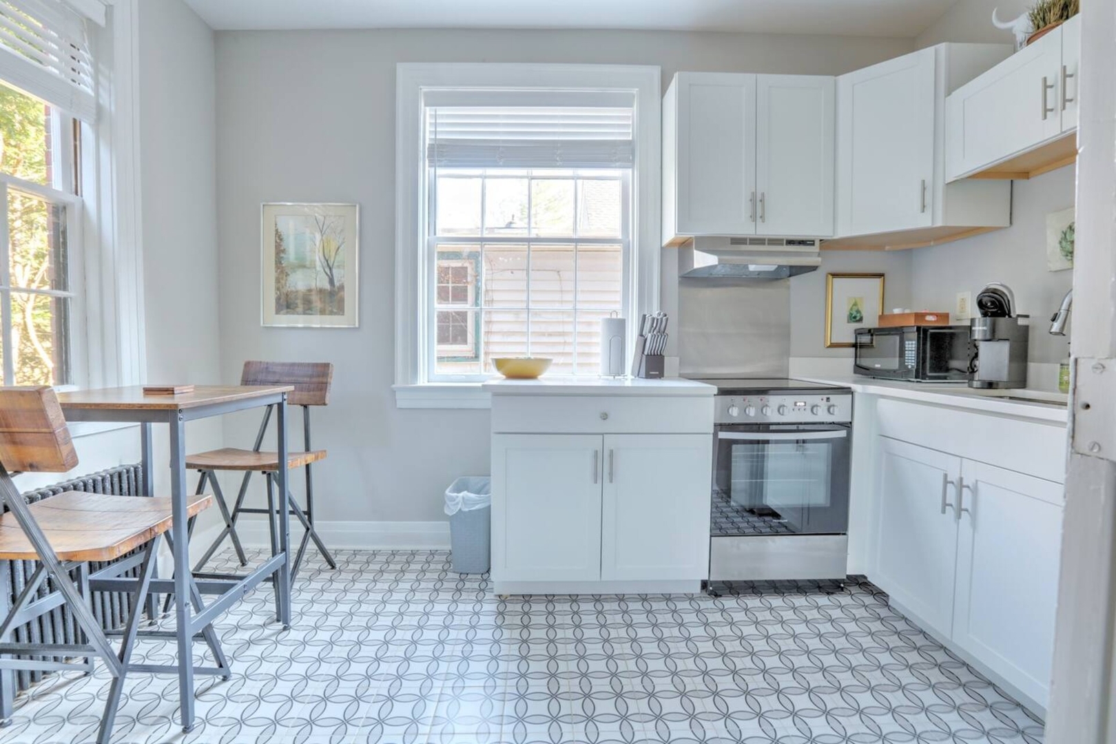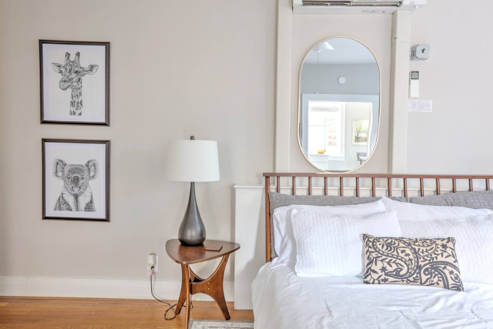 This one-bedroom apartment features a full-sized bed with fluffy linens. The art-deco style bathroom is stocked with hotel-quality towels. The freshly remodeled kitchen has all of the essentials you need to feel at home.