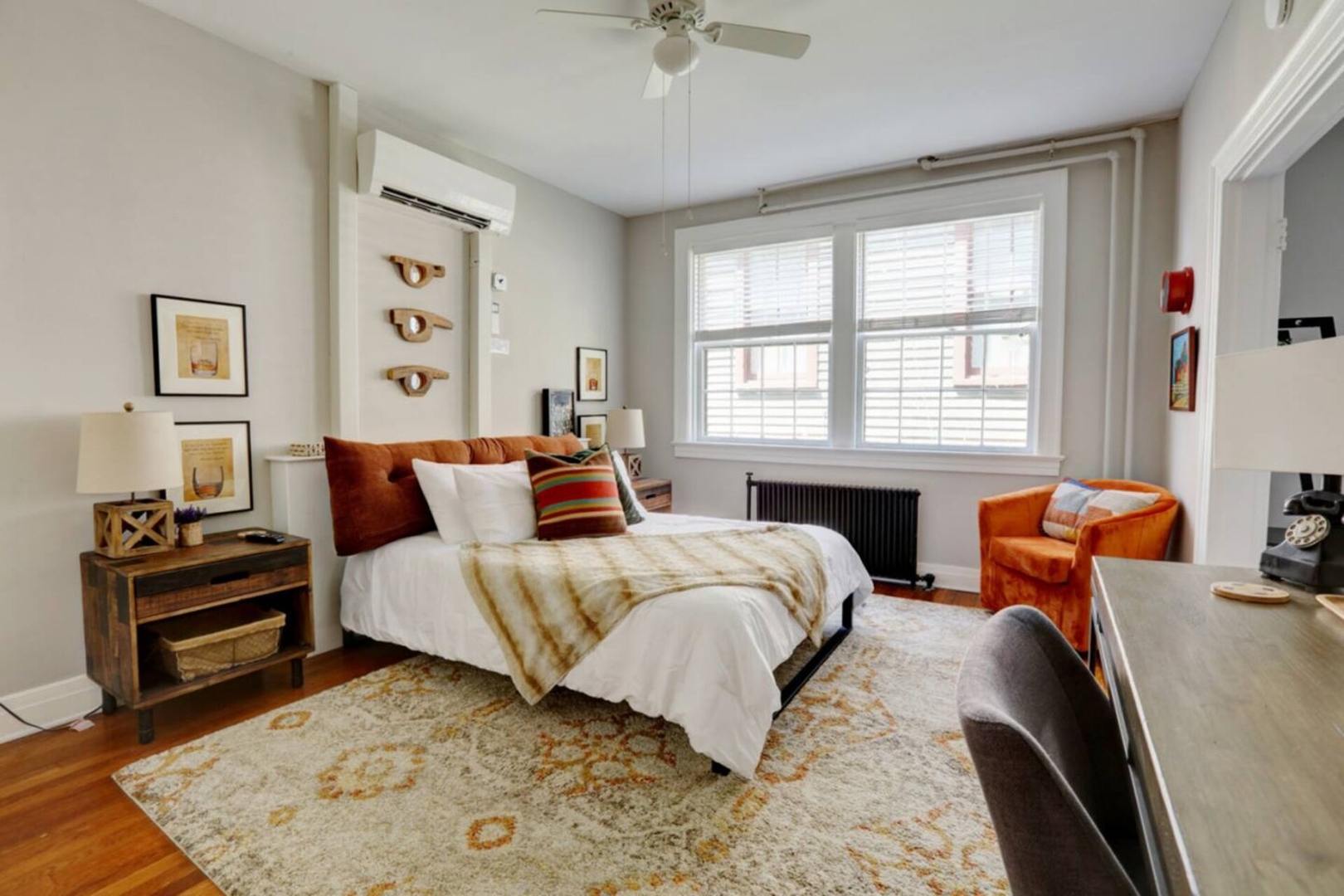 This one-bedroom apartment features a full-sized bed with fluffy linens. The art-deco style bathroom is stocked with hotel-quality towels. The freshly remodeled kitchen has all of the essentials you need to feel at home.